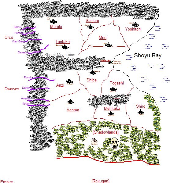 That done, they set out to walk out of the crypt, and the palace. The trapdoor took them down into a lamplit passage, along which they proceeded until they reached a stairway, which took them back up into the palace proper. There they found complete chaos. Cries of panic, functionaries running aimlessly in all directions, looters, armed men fighting. The disruption was so severe that they got most of the way to the exit before being challenged. Four guards, clearly taking refuge from the collapse of order within familiar routine, barred their way, spears levelled below slightly dubious faces. They exchanged glances, clearly nervous of these peculiarly powerful-looking gaijin, but their leader gestured authoritatively. "Throw down your weapons!" he ordered, his words translated by the Tongues spells cast on Sack and Surya, and Hildraft's Ta'nara power. Sack reached to his belt, and drew forth two small, flat, angular pieces of metal, glittering silver in colour. Hildraft and Surya recognized these as the Neshnamohn he'd taken from the Mortal Hunter Bramandin out of curiousity. Then, they'd been sharp, but inert. Now, as the half-orc flicked his wrists, the two small weapons hurtled across the intervening space, striking with deadly accuracy, looping back to drop back into Sack's hands and be thrown again, to strike again, before returning to his grasp, all in mere seconds. Slashed almost beyond recognition, the guard leader dropped with a splatter to the lacquered wooden floor, and the rest broke and fled in instant panic. Unimpeded, then, the four companions reached the open air. Still wearing the Robe of Eyes, Surya instantly spotted the major change; the roiling shadow-spirits that had enwrapped the palace in the same way as the ancestral spirits did the Clan citadels were gone. As they passed through the main gate, Sack paused to inscribe in large letters on the outside, "Vacant. To Let. Apply Within." before they walked through the streets of the Imperial city to the Mehitaka castle. Once there, they quickly ascended to the throne room, where they found the stern clanlord Mehitaka Hirayama seated in his presence chamber. Mehitaka Kaisigi, their erstwhile prisoner, was also there, still dressed in the same tattered arming jacket he had before; clearly, his status as their captive prevented him resuming the garb of a warrior before he either redeemed his honour or was released by his vanquishers. Realizing this, Hildraft spoke the required words, freeing him from their captivity, and he bowed deeply before going off to get dressed with some relief. The clanlord leaned forward, ready to hear their account. At first he was sceptical of their claim to have permanently slain the Dark One, although confirmation of the assertion that the dark spirits were gone from the Palace helped convince him. Sack asked him if he would like to see the corpse? Hildraft, siezed by a premonition, lunged forwards, but was too late to stop the half-orc unwrapping the newly-acquired Mirror of Life Trapping and showing it to the Lord of the Mehitaka. There was a flash, and a wisp of smoke disappearing into the Mirror, and Hirayama was gone, leaving only a small pile of clothing and a beautifully-scabbarded sword. Instantly, every armed shadowkami in the room had his weapons out, all levelled at the half-orc. Kaisigi was first to speak. "What have you done with our Clanlord?" he asked in dangerous tones. The tension crackled for a moment. Then Sack thought a word of command, and the Lord was returned - in rather undignified nakedness. His presence and charisma proved itself, however, as he managed to look authoritative and composed even at that moment. He turned to Sack. "Explain yourself," he demanded in no uncertain terms, "there was no-one in there, nothing but silver walls! Where is this body?" Sack mimed a contrite apology, signing that he had expected the body to be there. The tension was broken by the arrival of a messenger, bringing the news that the other clanlords had begun to withdraw from the Imperial city to their heartlands. Complete stillness fell, and Hirayama resumed his attire in a rather stiff silence as his vassals sheathed their weapons. It seemed that this was significantly bad news. Kaisigi explained that this was an unmistakable sign of preparation for war; only the Emperor's peace kept the clanlords from each others' throats normally, and if a succession crisis occurred (as it obviously had), the different factions would slide into war. Naturally, the clanlords needed to be in a safe place at that point, and so they would retire to their strongest castles before commencing hostilities. Sasutora was entering Interesting Times.