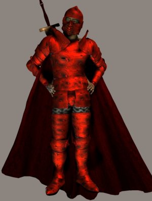 Bloodred plate armour encased a tall and well-built humanoid form. A dark red cloak hung behind him, and the hilt of a massive greatsword protruded over his right shoulder. He could be no other than Thykon the Blood Snake, and the companions scented blood. Eloy nocked an arrow, Lynien prepared herself to take the left-hand stairs, and Gorfang mounted Shamlakh and poised to head for the right-hand staircase. Then Méabh stood up and cast Finger of Death straight at the Blood Snake.