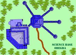 "Do we have any information about the inside?" asked Manx. "Try the gov's handcomp," suggested Alice. This made a lot of sense, so Manx dug it out and located the science base files. The device's holoprojector came on and it presented a 3d wireframe of the facility, hovering an inch above the computer and glowing faintly green among the darkened trees. Manx was glad they were out of direct sight of the windows as he peered at the layout. There were not one but two comms rooms marked, one in the main dome and one in the large annex. There were also areas marked "Reagent Extraction" and "Jump Field Simulation", which caused some head-scratching.