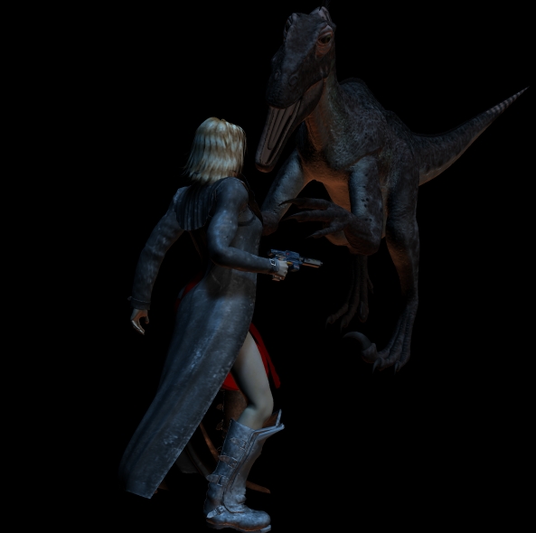 Alice flicked her pistol to automatic and hunkered down to present a smaller target, expecting gunfire, but what emerged from the dark fronds of the jungle was anything but what she expected. With an explosive rush, some kind of bipedal animal hurtled out of the bush and leaped snarling at Alice's throat. She hurled herself to one side and it missed by inches, landing neatly some ten feet away and whirling ready to leap again. Alice fired, her first burst going wide but the second hitting the thing in the leg. Two 4mm gauss bullets in the knee will slow anything, and the beast stumbled and began to drag itself forwards. Backing off rapidly - it was still nearly as fast as she was - she took careful aim and fired again, smashing the thing's other femur and dropping it to the ground. Raising its' head it gave a dreadful screaming roar, part animal part bird; but it seemed more frustration at not being able to reach her than pain.