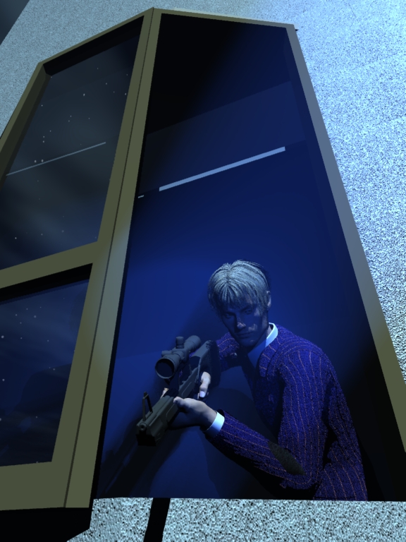 Reaching their floor, and smashing through the door into Martha's suite when the electric locks failed to operate, they hastily tackled-up with more serious weaponry to taste. Martha spent a couple of moments shrugging into her suit of Maximillian CorpTrooper armour, while the others used one of the PAYG handcomm units they'd bought for negotiating to contact Benkin and Burkins. Benkin, as ever keeping an eye on the old General, reported that they were also headed for the rooms, moving slightly more slowly - paradoxically for his benefit; Burkins with his ruined eyes was far less disorientated by the darkness than he was.