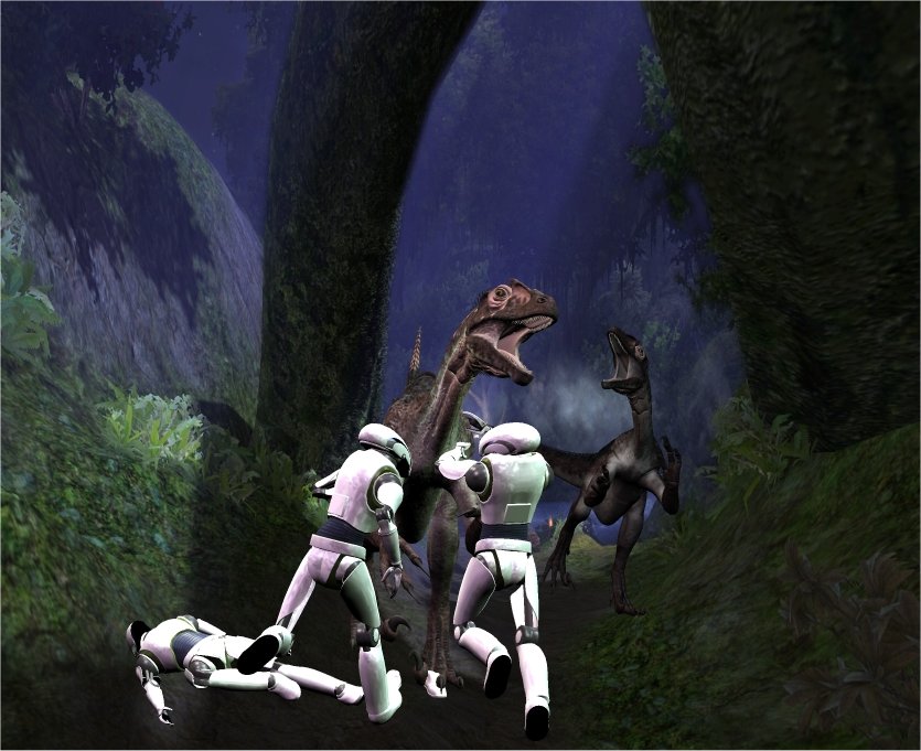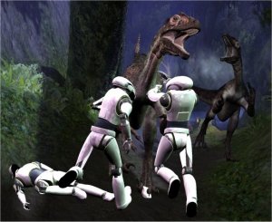 "Sounds nasty," commented Zugh the Vargr, checking the ACR he'd chosen from the heap of spare weapons. Martha looked at him. "What does?" she asked testily. Zugh blinked. "Oh, yes, flat-face hearing," he said, and opened the window. "That!" he added. From below, sounds of yelling and screaming, mixed with odd gunshots, strange snarling and nasty crunchy noises rose to their startled ears. "What the hell is going on out there?" blurted Martha, walking quickly to the window and looking out. Below, in the car park, she could see a confused and panicky mass of the rest of the staff and scientists - and the occasional security guard - milling around as some kind of massive bipedal lizards slashed and bit their way through them, killing seemingly at will, herding them like sheep. Some of the civvies were scattering into the jungle, but from the monsters that loped after them their prospects were poor. The brighter ones were fleeing back into the hotel, and the few security guards were desperately attempting to cover their retreat. Those who'd been on duty had assault rifles, and a couple of the monsters went down, but the majority had been off-shift and had only pistols; their bullets were simply bouncing off the things. Two of the guards were already down, and the rest weren't going to last much longer.